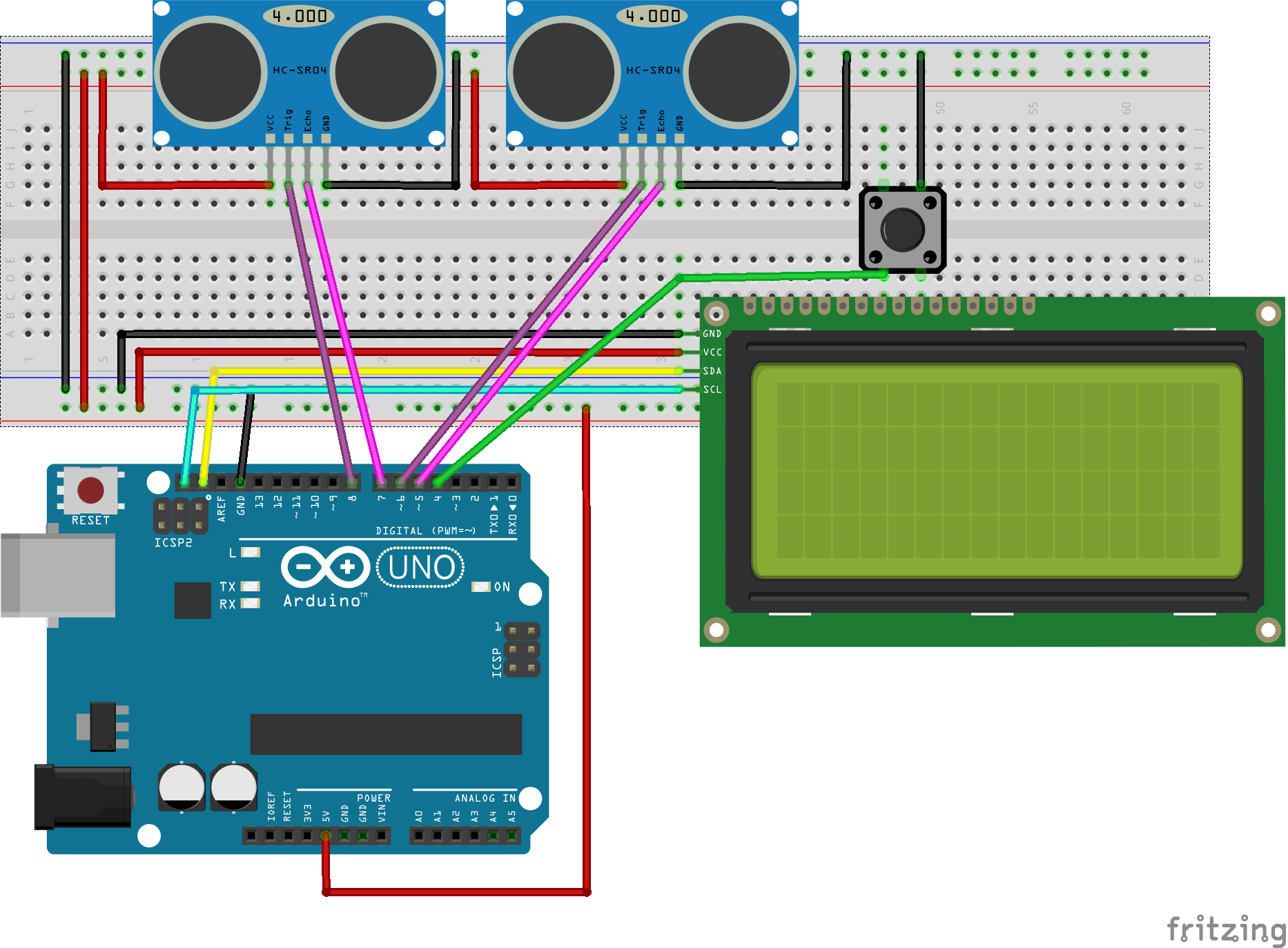 Como podéis observar, en este proyecto he implementado con dos sensores de ultrasonido HC-SR04 los cuales nos mide las distancias a la velocidad del sonido.